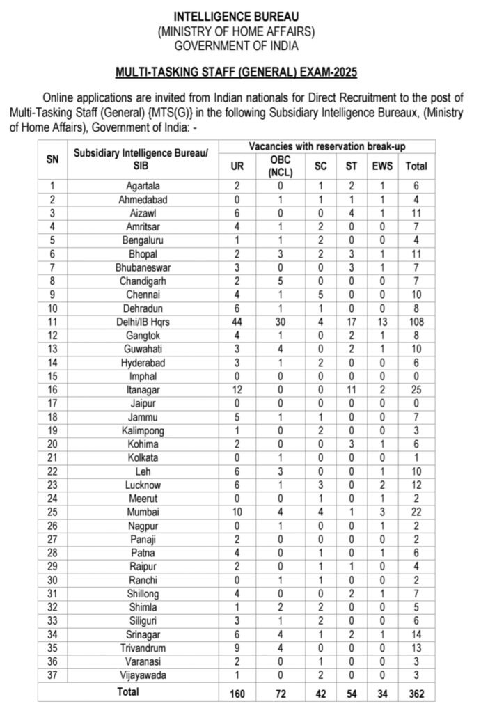 गृह मंत्रालय , इंटेलीजेंस ब्यूरो पूरे भारत स्तर पर सभी राज्यों और केंद्र शासित प्रदेशों में कुल 362 पदों पर एमटीएस की नौकरी निकाली गई है। पदों का विवरण इमेज में देख सकते हैं।