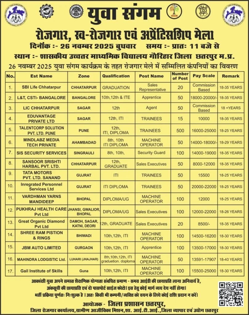 Rojgar Mela: 10वीं 12वीं ग्रेजुएशन आदि की पढ़ाई का नौकरी की तलाश कर रहे लाखों छात्र छात्राओं के लिए बहुत बड़ी खुशखबरी है ! अभ्यर्थियों के लिए रोजगार मेला में शामिल होकर नौकरी पाने का शानदार मौका है , मध्य प्रदेश के छतरपुर में एक युवा संगम रोजगार मेला का आयोजन होने जा रहा है जहां पर हजारों पदों पर अभ्यर्थियों को रोजगार दिया जाएगा।